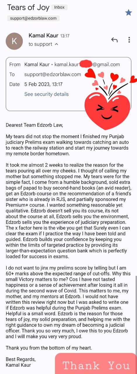 "Edzorb doesn't sell you its course, its not about the course at all, Edzorb sells you the environment, Edzorb sells you the experience of judiciary preparation. The x factor here is the vibe you get that Surely even I can clear the exam if I practice the way I have been told and guided. Edzorb builds your confidence by keeping you within the limits of targeted practice by providing its larger-than-expectation question bank which is perfectly loaded for success in exams..."